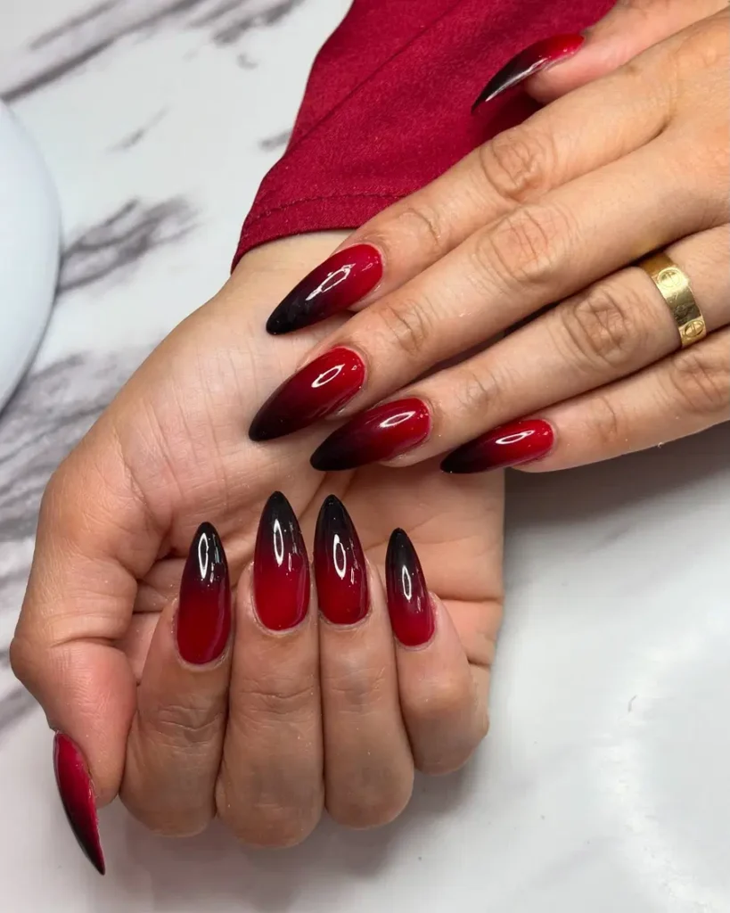 Rich red tones fade smoothly into deep black, creating a sleek ombre effect that feels bold and elegant. The high-gloss shine adds depth and makes the color transition stand out beautifully. With a sharp almond shape, these red and black nails give off a confident, dark femme vibe that looks powerful and timeless.