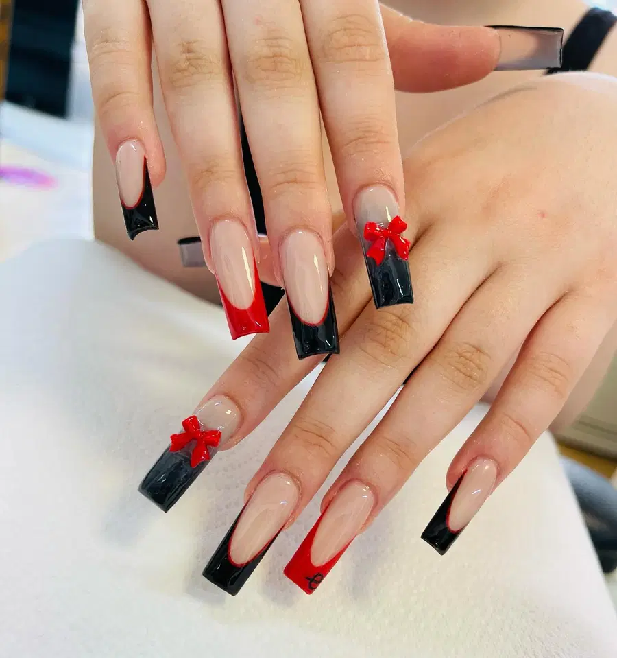 5. Red Bow Accents on Sharp Black French Tips