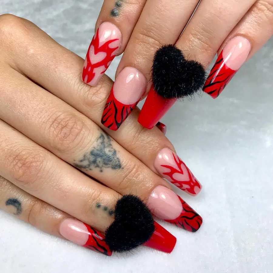 A sheer nude base keeps the look balanced while bold red flame designs bring heat to the tips. The black fuzzy heart accents add texture and a playful twist that feels unexpected and fun. With long square shapes and glossy shine, these nails feel bold, expressive, and full of attitude.