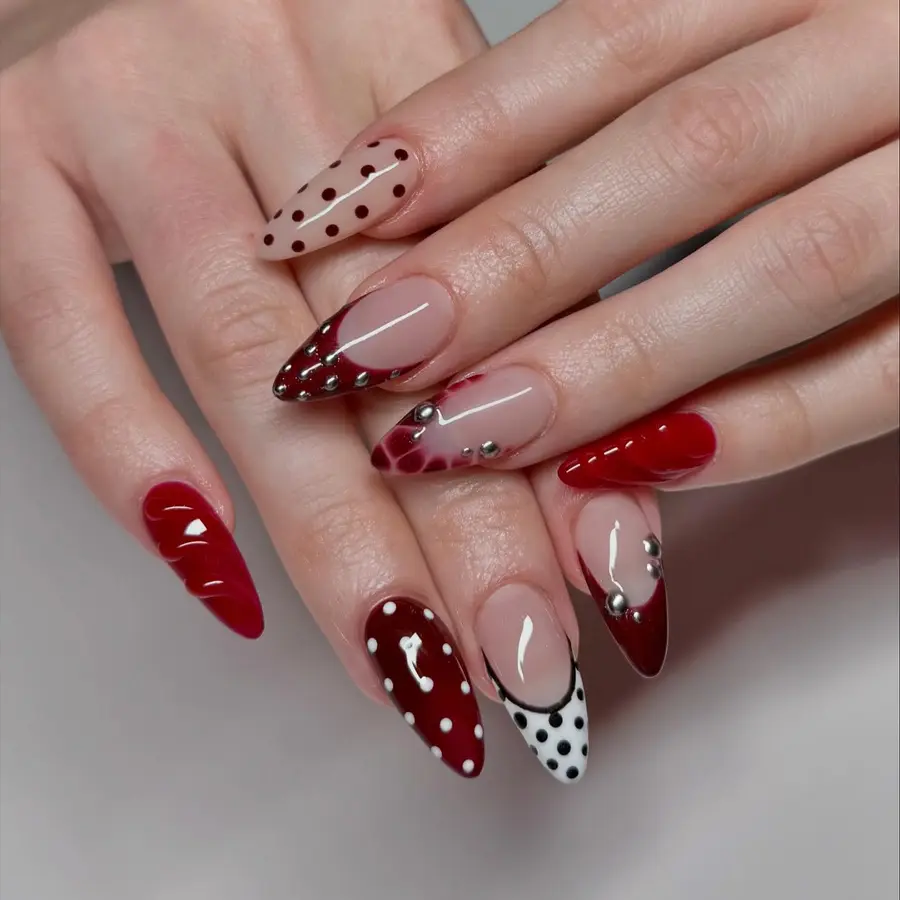 Soft nude tones create a calm base, letting deep red accents take the spotlight. Polka dots, glossy tips, and subtle gem details add texture without feeling overdone. The pointed shape gives these nails a bold edge, blending playful details with a confident, dark femme vibe.