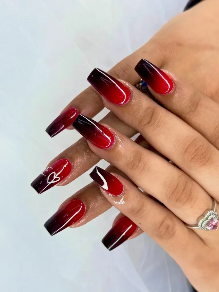 A rich red base melts into deep black tips, creating a smooth, glossy fade that feels sleek and dramatic. A thin white line detail adds a subtle accent without taking away from the bold color blend. The long square shape keeps the look clean and powerful, giving these nails a polished, dark femme finish.