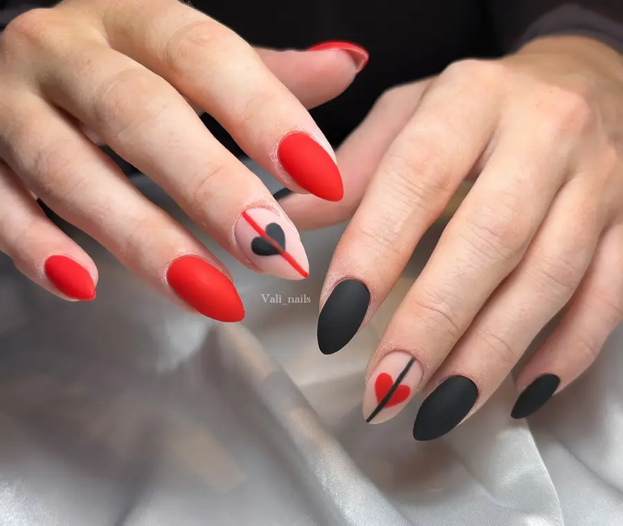 A smooth matte finish gives these nails a soft, modern feel while bold red and black shades create strong contrast. Minimal heart details and fine lines add a romantic touch without overpowering the look.