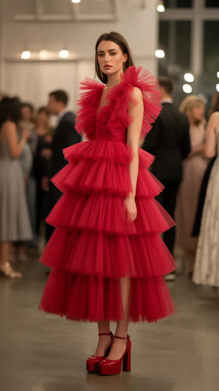 4. Ruffled Red Tulle Dress With Platform Heels