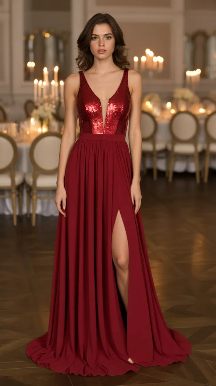 9. Long Red Gown With Sequin Bodice And Slit