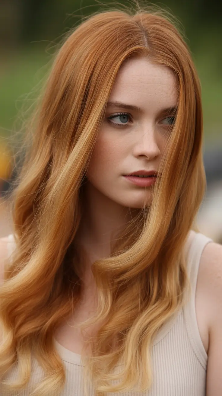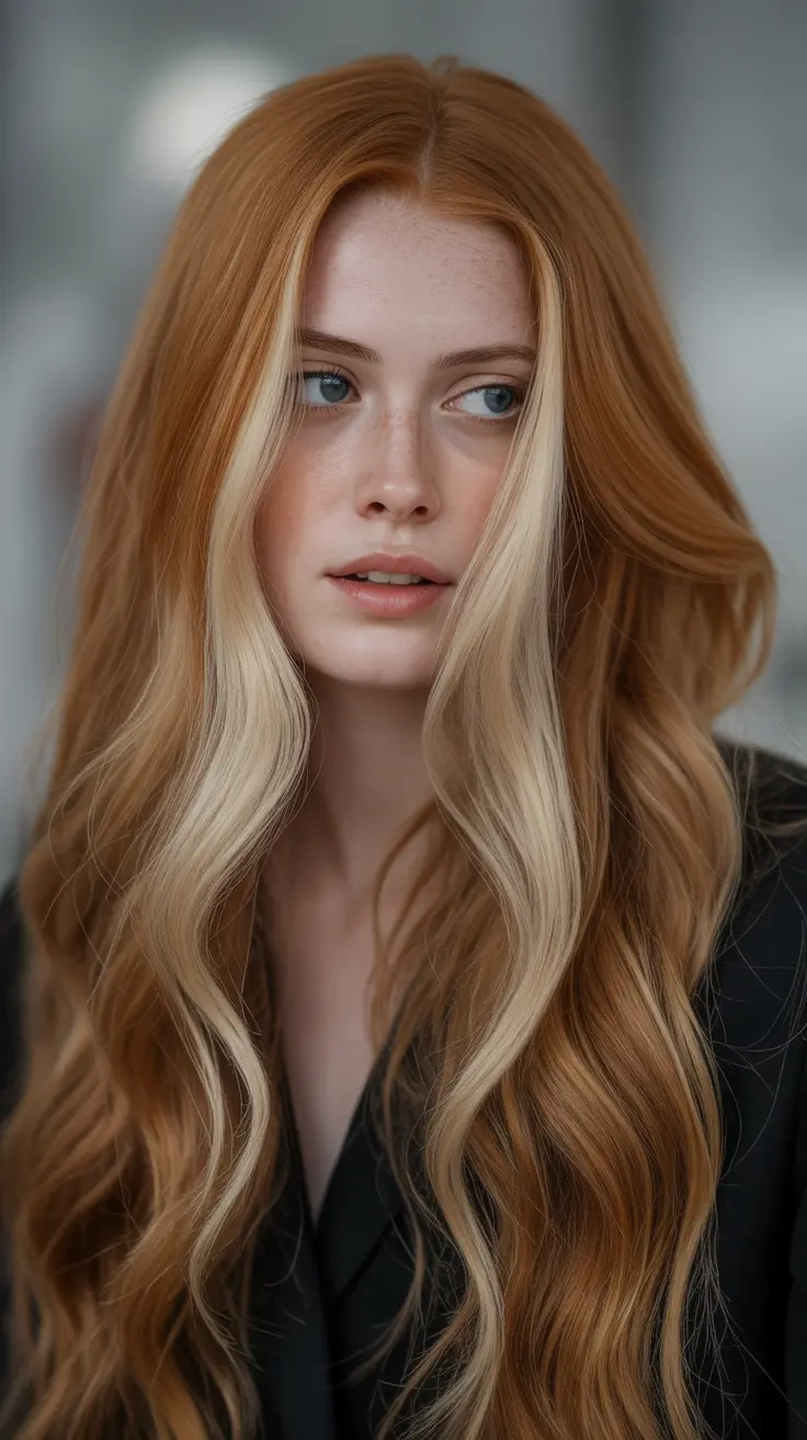 Long red waves with golden blonde highlights create a stunning look that captures attention. This hairstyle combines the warmth of red hair with the brightness of blonde, resulting in a beautiful blend that feels fresh and vibrant.