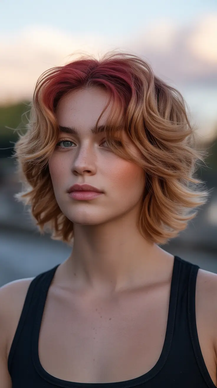 The choppy red blonde lob is a stunning hairstyle that brings together warmth and light in a playful way. This look features a mix of vibrant red and soft blonde tones, creating a beautiful contrast that catches the eye. The choppy layers add texture and movement, making it a fun choice for anyone looking to refresh their style.