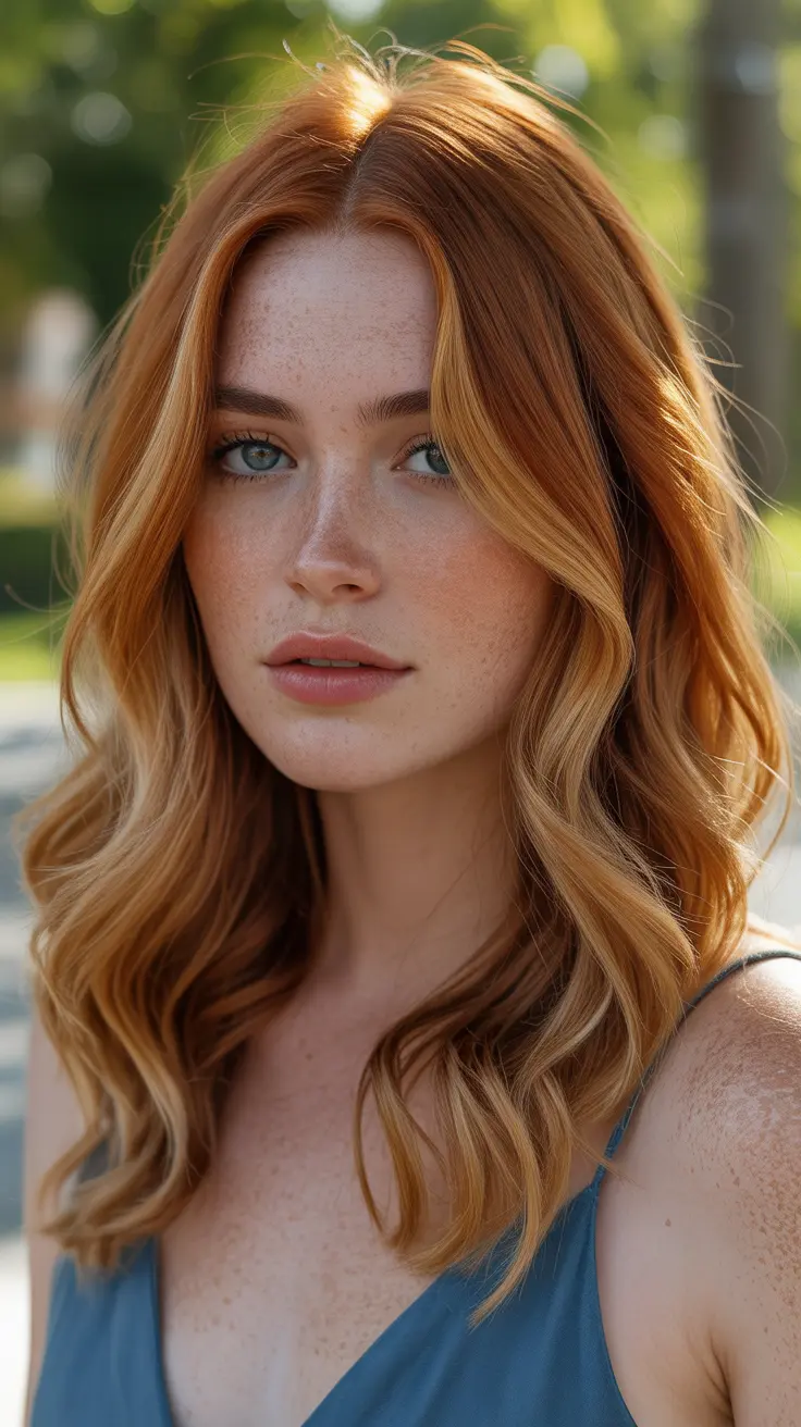 The soft waves add dimension and movement, making the hair appear fuller and more lively. This style is perfect for those who want to stand out without going overboard. The golden blonde highlights enhance the red base, giving it a sun-kissed effect that’s perfect for any season.