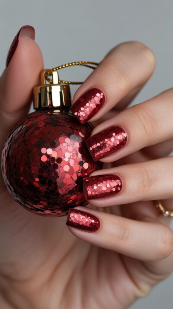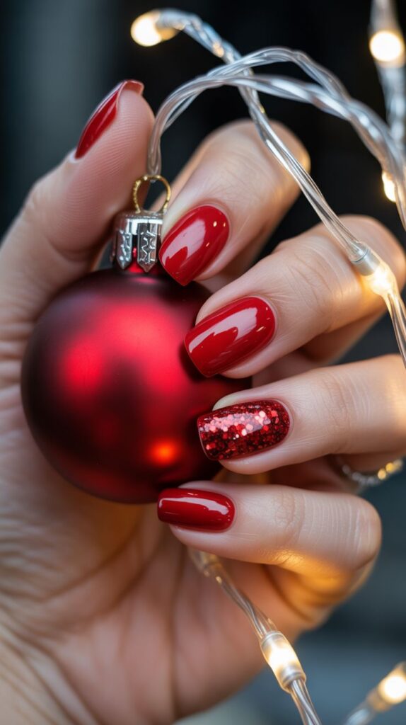 If you love sparkle, this is your moment. Go full-on glitter with a dense ruby red polish that glows from every angle. These nails scream holiday confidence and look incredible in photos.