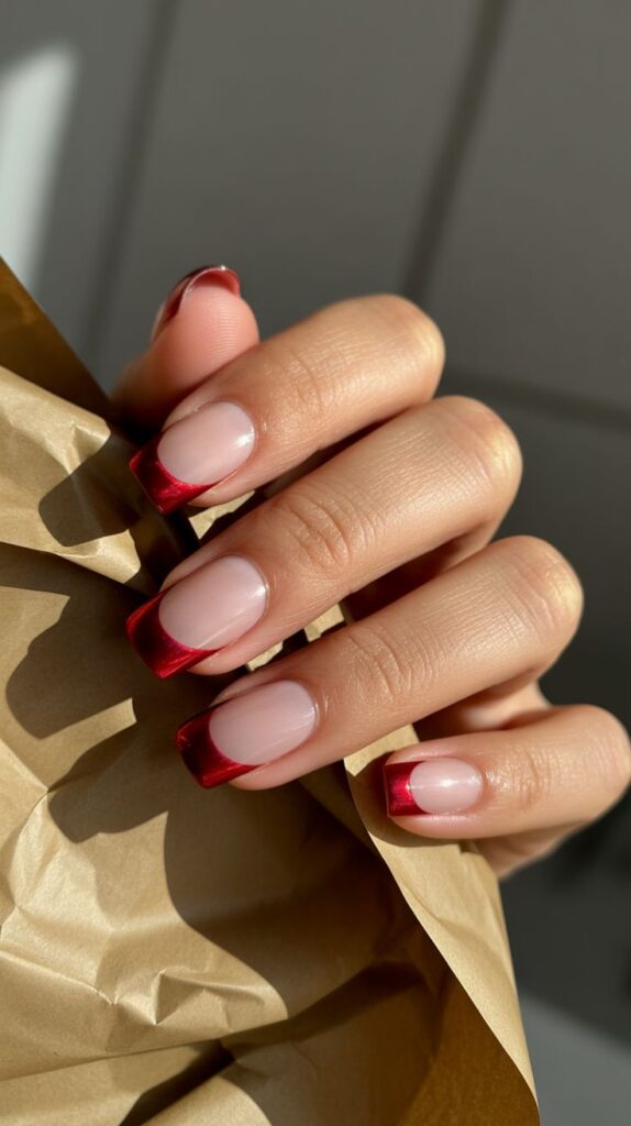 A sophisticated fusion of classic and modern. The subtle metallic red tips over a glossy nude base create a refined, festive vibe that fits any winter gathering.