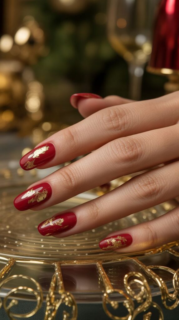 Glamour meets texture in this luxurious look. Scatter gold foil over a deep red base for a chic, high-end finish that feels like jewelry for your nails. Perfect for both parties and date nights.