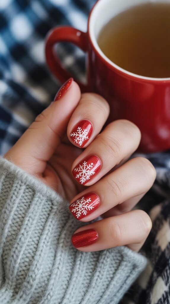 The ultimate December nails red polish dusted with fine glitter and adorned with white snowflakes. It’s the perfect festive manicure for cozy celebrations or nights out under twinkling lights.