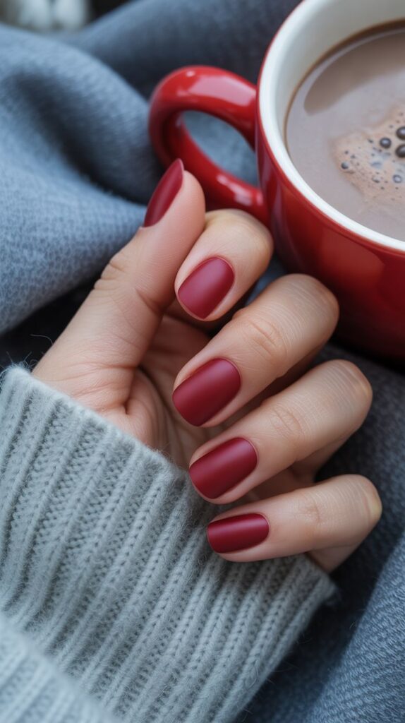 For a modern twist on red, go matte. The velvety texture feels smooth and understated while keeping the festive tone alive. Pair it with gold rings or sparkly accessories to highlight the contrast between soft and glam.
