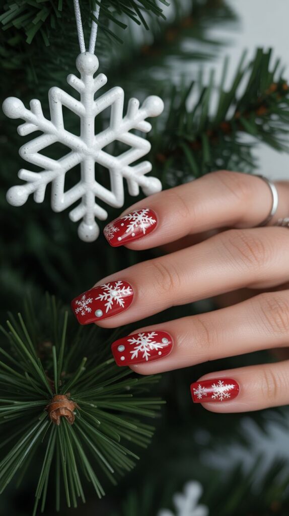 4. Red and White Snowflake Nails