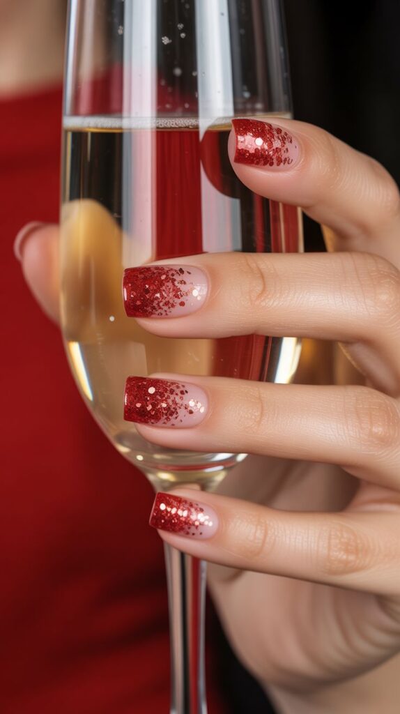 This shimmering fade captures the essence of festive sparkle. Blend solid red into glittery tips for a snow-inspired gradient effect. A must-try for December nails that shine under party lights.