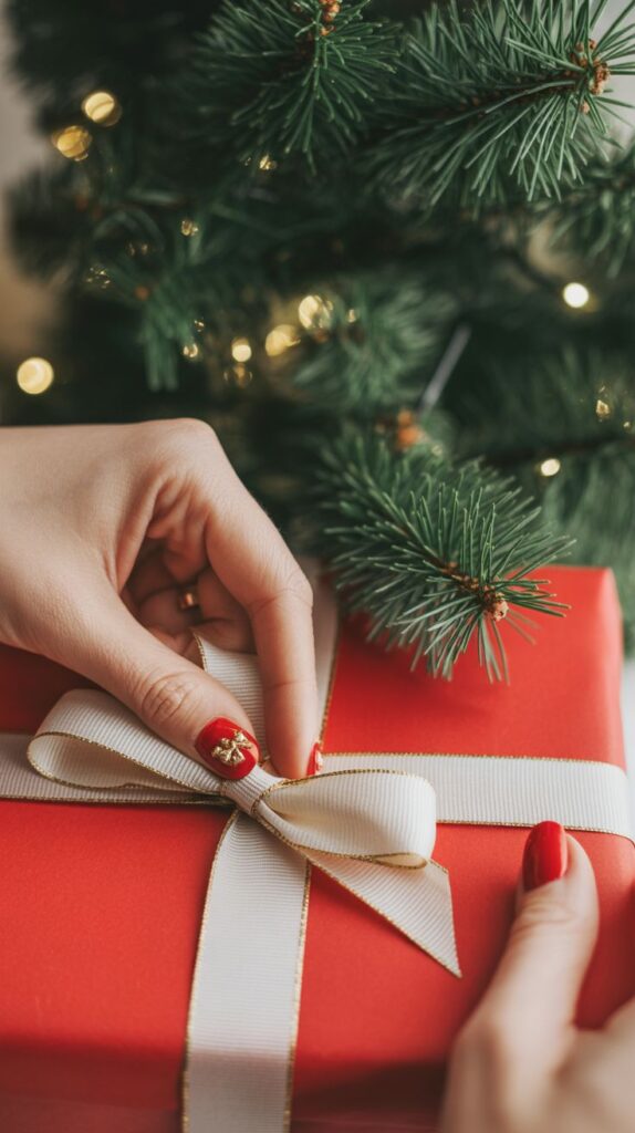 Turn your manicure into a festive accessory with dainty bows painted in gold or white. This look feels like your nails are wrapped up in Christmas joy perfect for photos and parties alike.