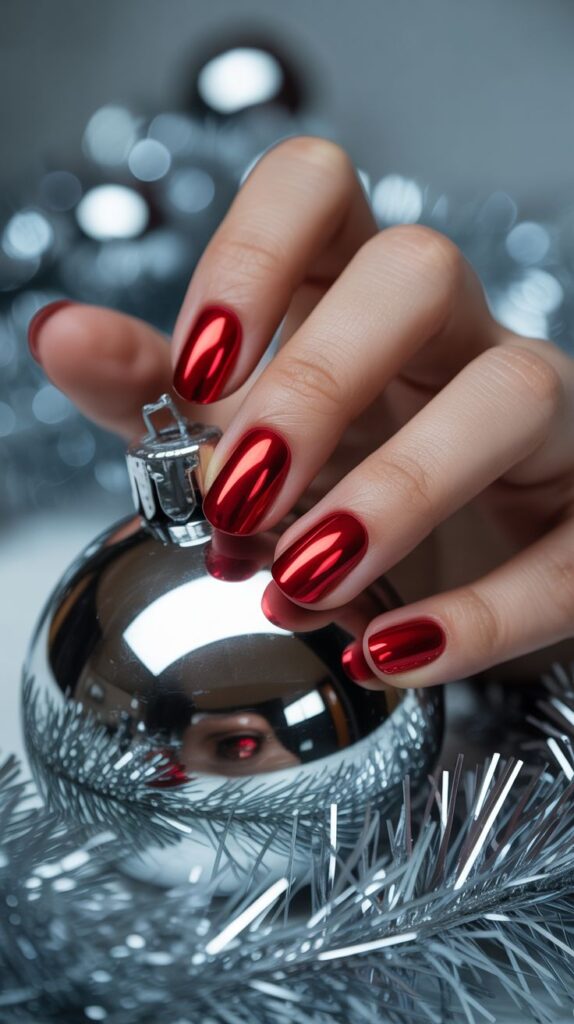 Polished and futuristic, red chrome nails deliver a mirror-like glow that instantly catches the eye. Their smooth metallic finish reflects Christmas lights beautifully, making them ideal for glam celebrations.