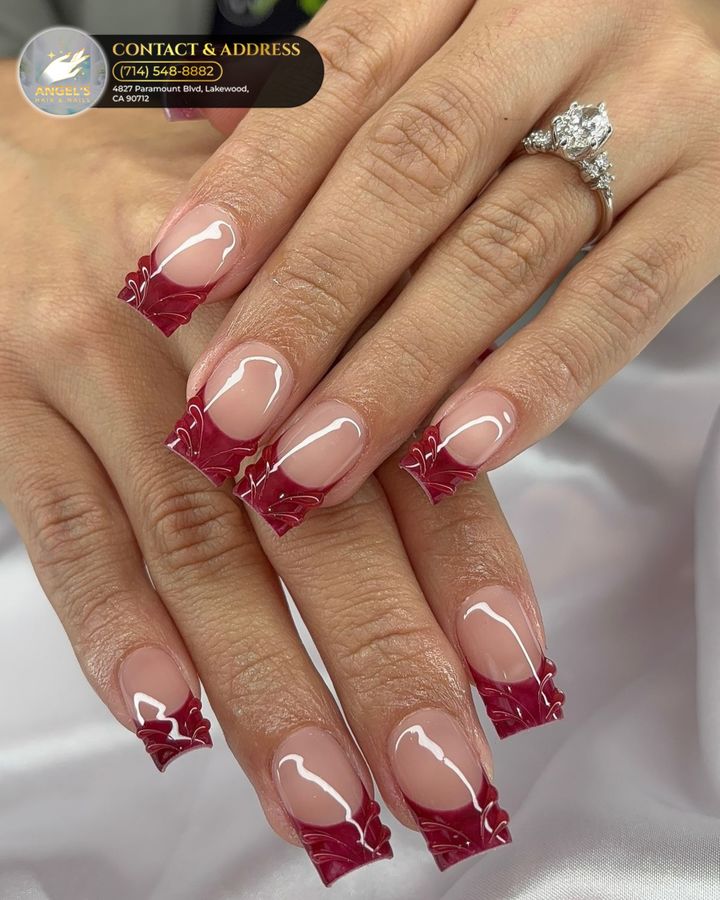 This unique red french tip design includes sculpted floral textures that take the manicure to another level. The glossy rose-red tips blend seamlessly with a soft nude base, offering a dimensional effect that feels artistic and luxurious. If you enjoy bold, creative nail art that still stays elegant, this is a stunning pick.