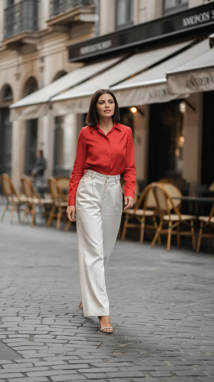 The combination of a red long sleeve shirt and white wide-leg pants is a classic look that never goes out of style. This outfit strikes a perfect balance between boldness and elegance. The vibrant red shirt adds a pop of color, making it a standout piece in any wardrobe.