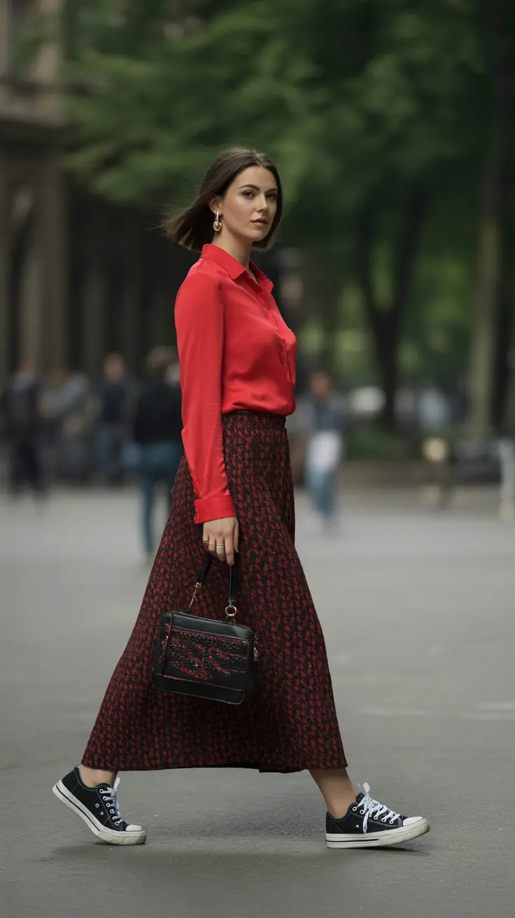 The vibrant red shirt adds a pop of color, while the floral maxi skirt brings in a touch of elegance. This mix creates a balanced look that stands out without being overwhelming. Sneakers complete the outfit, offering a laid-back vibe that keeps you comfortable all day.