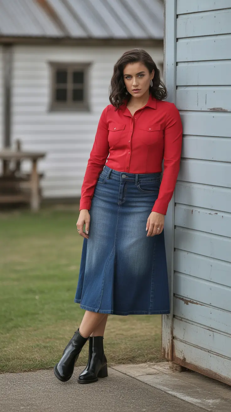 The combination of a red long sleeve shirt with a denim midi skirt creates a stylish and approachable look. This outfit is perfect for various occasions, whether you’re heading to brunch or a casual day out. The red shirt adds a pop of color, making it a standout piece in your wardrobe.