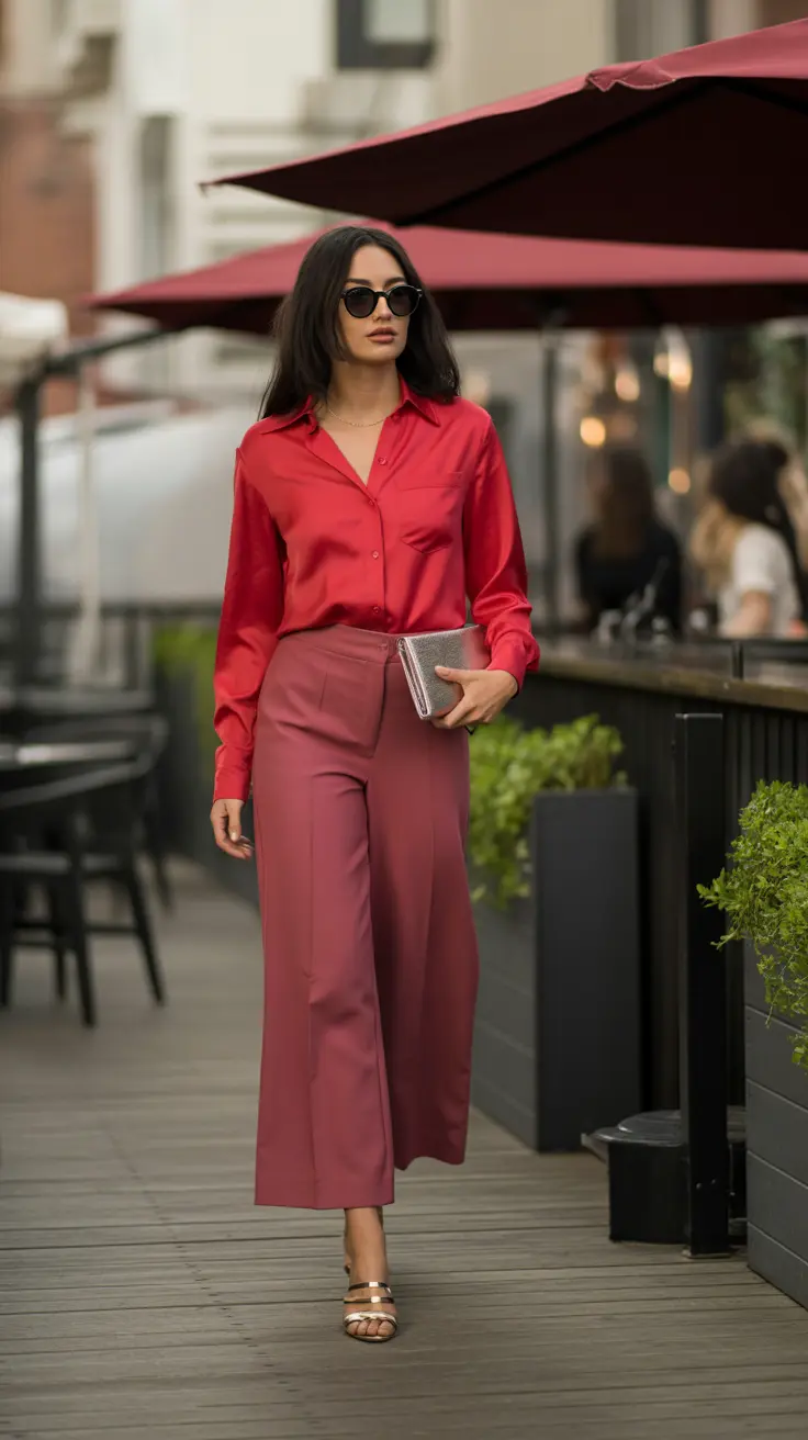 Wide-leg pants are not only comfortable but also versatile. They create a chic silhouette that pairs beautifully with the fitted nature of the red shirt. This outfit is perfect for various occasions, from casual outings to more formal events.