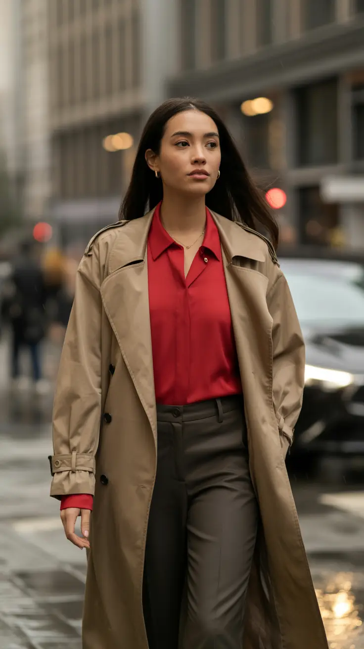 The trench coat, in a classic beige, complements the red perfectly. It adds sophistication while keeping you warm during cooler days. This layering is not just practical; it also enhances the overall look.