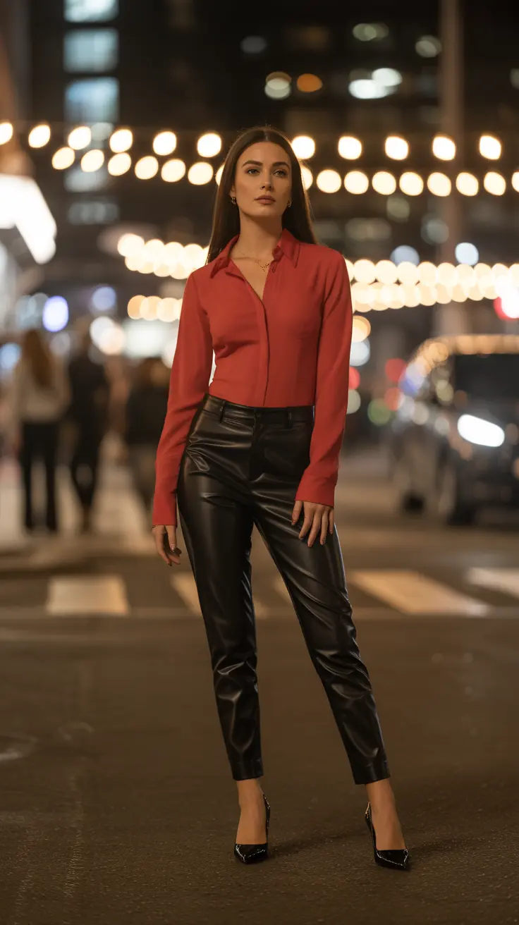 If you’re looking for outfit inspo, this combination is a must-try. The balance of textures between the soft fabric of the shirt and the shiny leather creates a visually appealing contrast. Whether you’re heading to dinner or a party, this outfit is sure to make a statement.