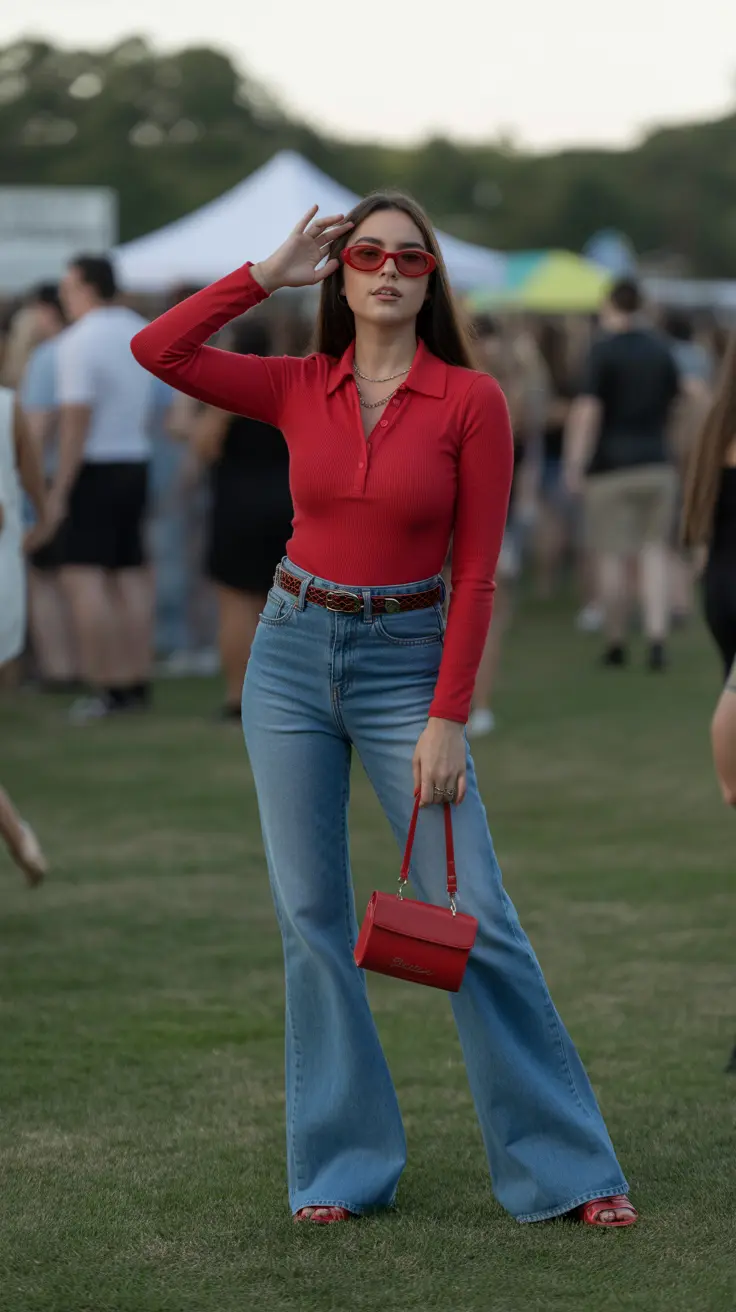 Flared jeans are not only comfortable but also add a retro vibe to the outfit. They balance the fitted nature of the shirt, creating a flattering silhouette. Pairing this outfit with retro shades elevates the entire look, giving it a chic and trendy feel.