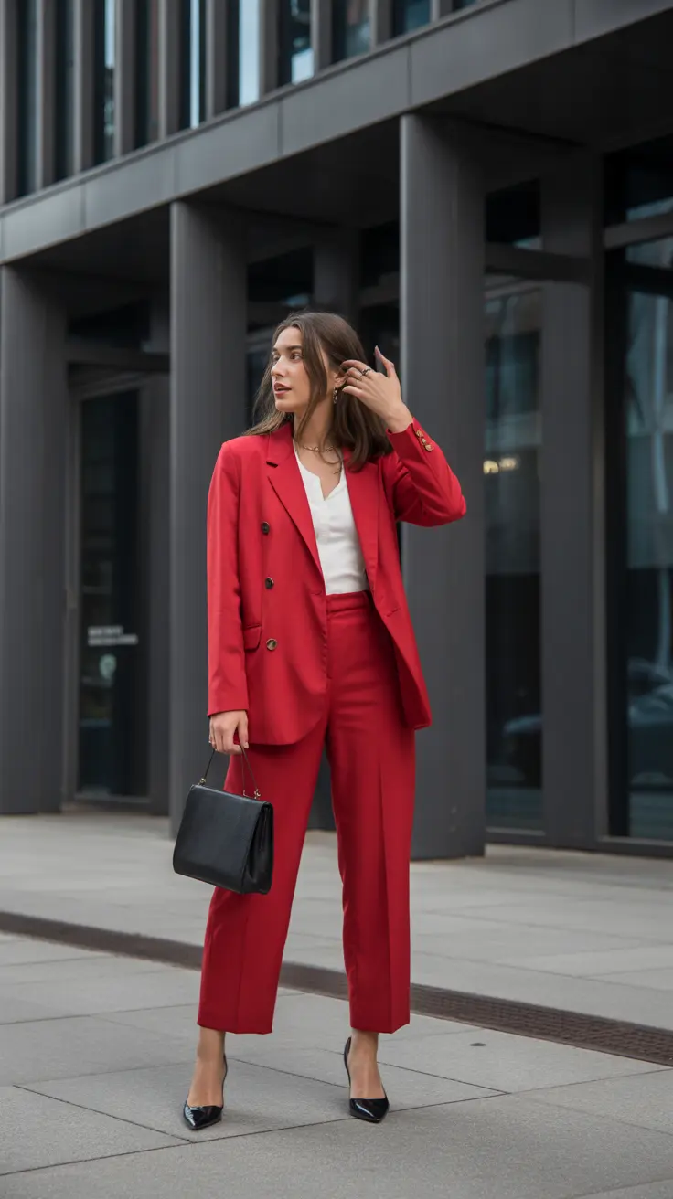 This look is ideal for those seeking outfit inspo that balances everyday glam with professional flair. The monochrome red vibe can be enhanced with matching accessories or kept simple for a more understated approach. Either way, it’s a statement outfit that exudes confidence.