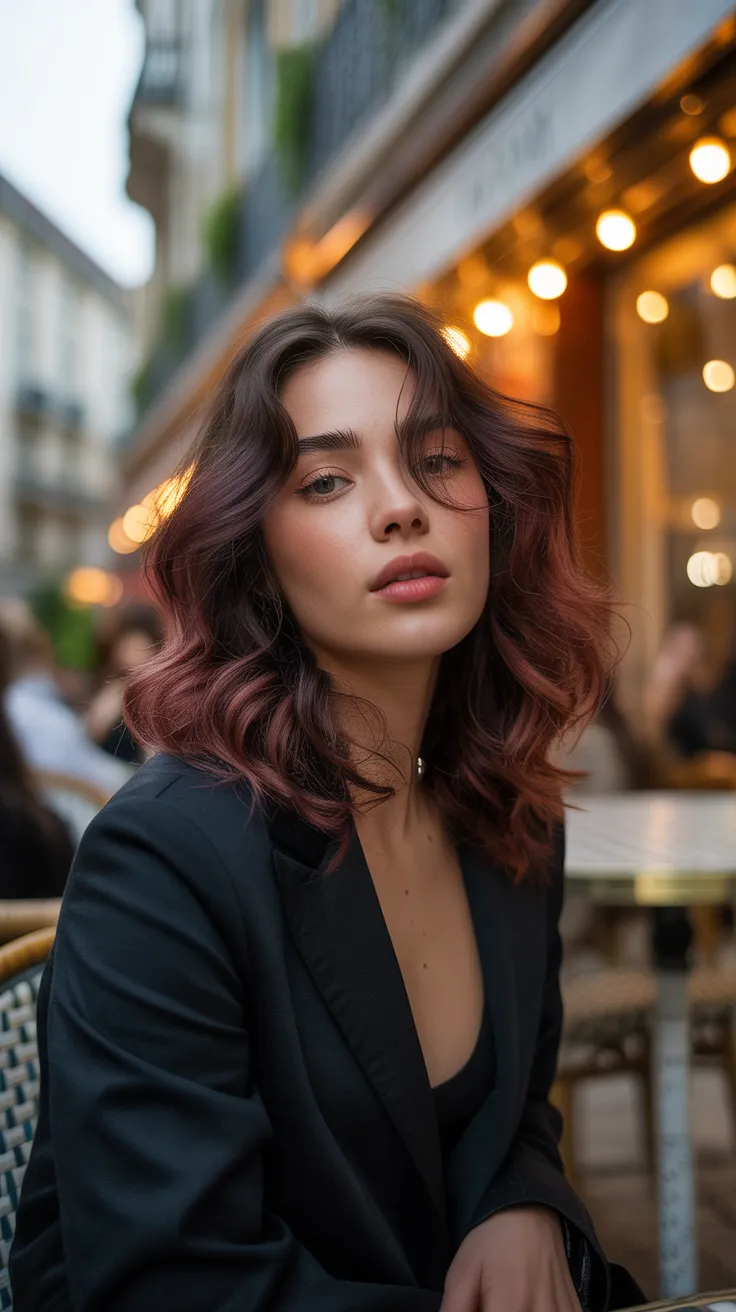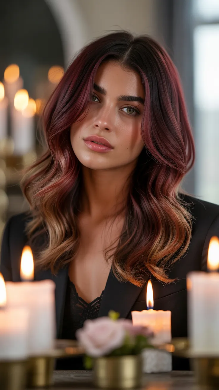 The image captures this beautiful transformation perfectly. The soft waves add movement and dimension, allowing the colors to shine. This look is not just about color; it’s about creating a visual journey from dark to light, reminiscent of a fine glass of red wine.