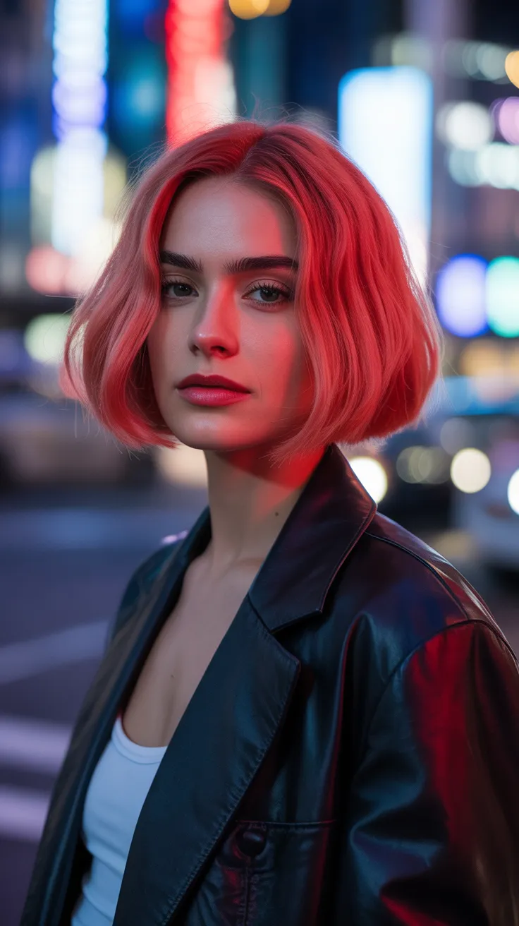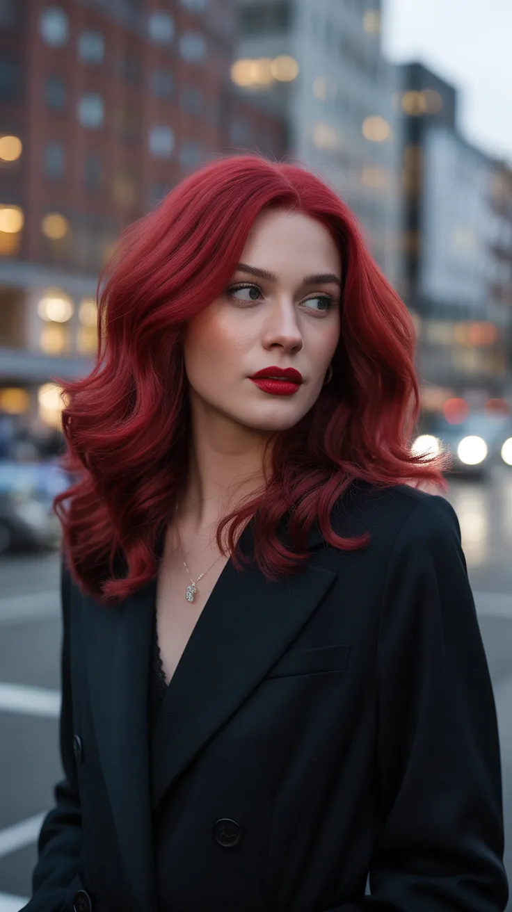 Ruby red hair is a striking choice that instantly grabs attention. This bold shade radiates confidence and flair, making it a perfect option for anyone looking to make a statement. In the image, the vibrant red hair stands out beautifully against the urban backdrop, showcasing how this color can elevate your style.