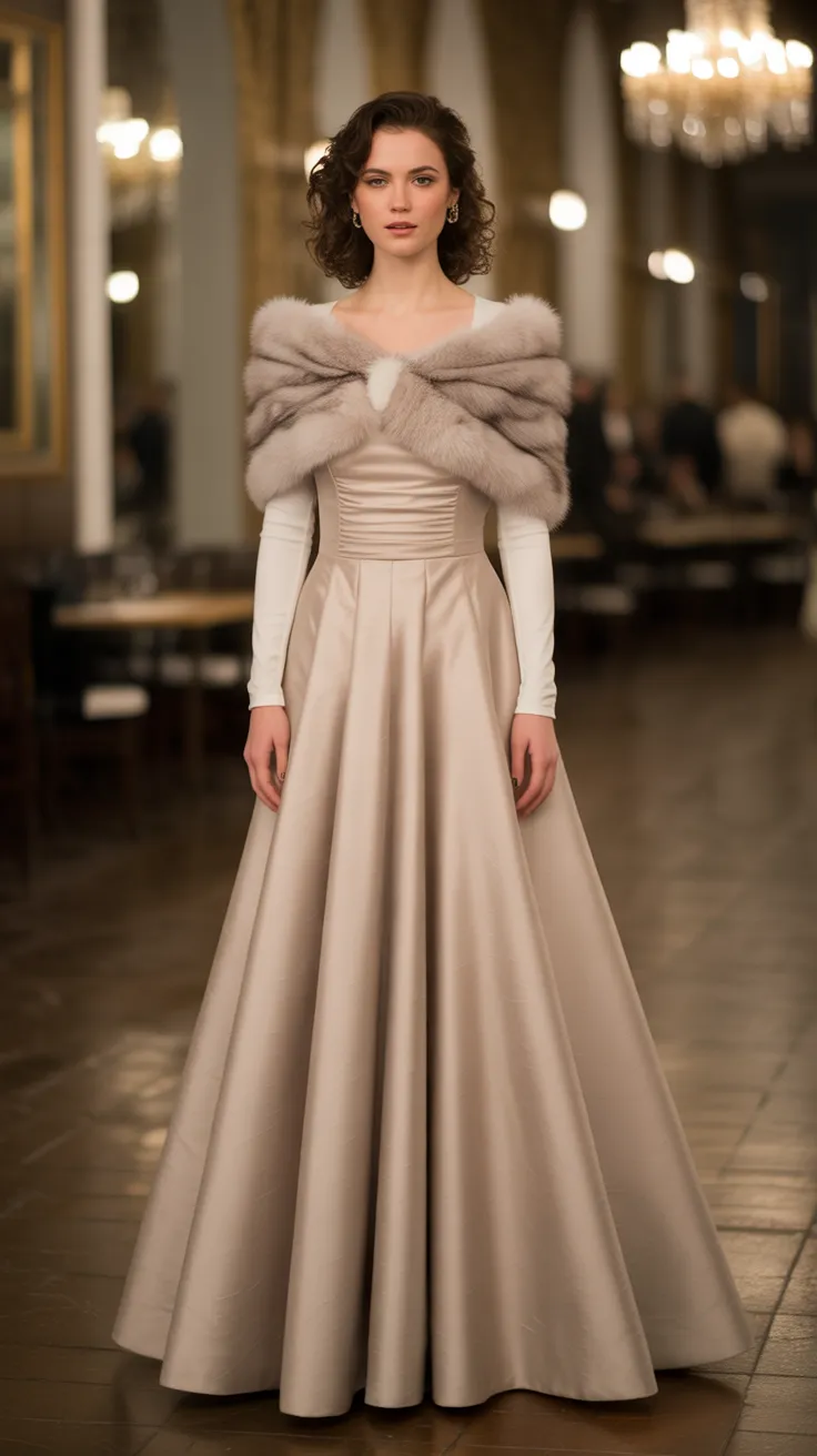 The gown’s neutral tone complements the rich texture of the fur, making it a versatile choice for various color palettes. Pairing this outfit with simple accessories allows the gown and wrap to take center stage, showcasing your style effortlessly.