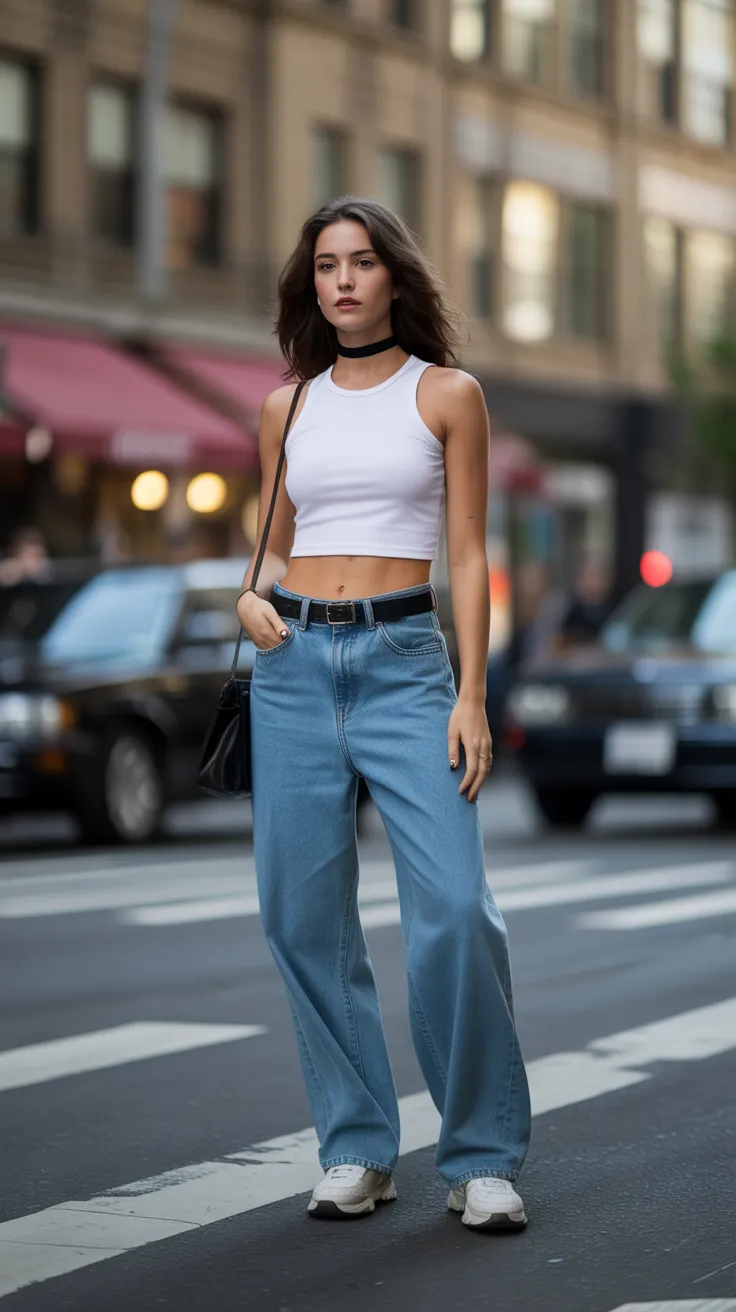 Baggy jeans are a staple of 90s women’s fashion outfits, and they bring a laid-back vibe that’s hard to beat. Pairing them with a cropped tank top is a classic move that highlights the waist while keeping things casual. This look is perfect for a sunny day out or a relaxed hangout with friends.