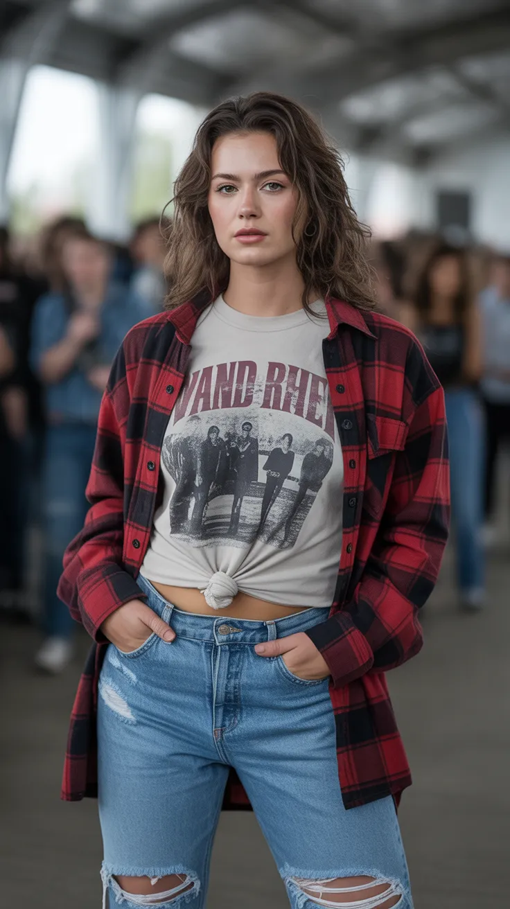 The vintage band tee paired with ripped jeans and a flannel shirt is a classic look that screams 1990s fashion women casual. This outfit perfectly captures the laid-back vibe of the decade while showcasing a love for music and style.