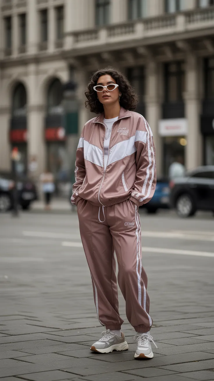 Nothing screams 90s women’s fashion outfits like a stylish tracksuit set. This look is all about comfort and flair, making it perfect for casual outings or lounging at home. The soft pink color and sporty design bring back memories of iconic pop culture moments.