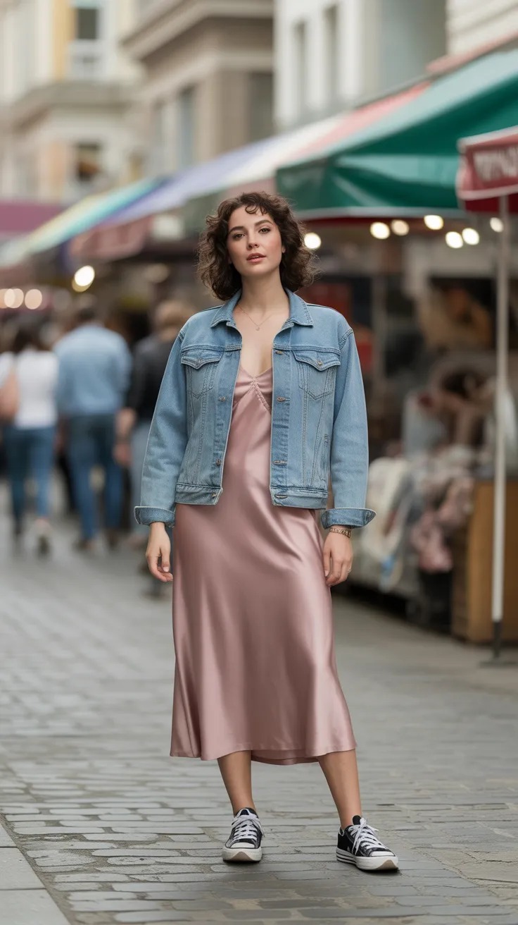 The denim jacket adds a touch of laid-back coolness, while the midi dress brings a feminine vibe. This outfit beautifully captures the essence of 1990s fashion women casual, blending comfort with style effortlessly. Sneakers complete the look, making it practical for any adventure.