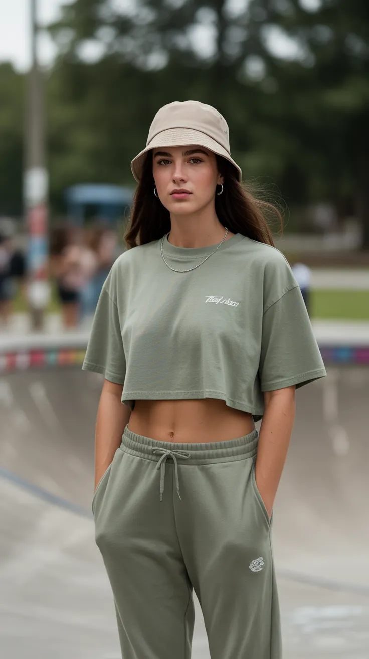 Joggers are a staple in 1990s fashion women casual wear, offering a relaxed vibe that’s perfect for any outing. The model showcases this outfit effortlessly, with her hair styled in braids, adding to the retro feel. This look is perfect for those who want to channel their inner 90s girl while staying trendy.
