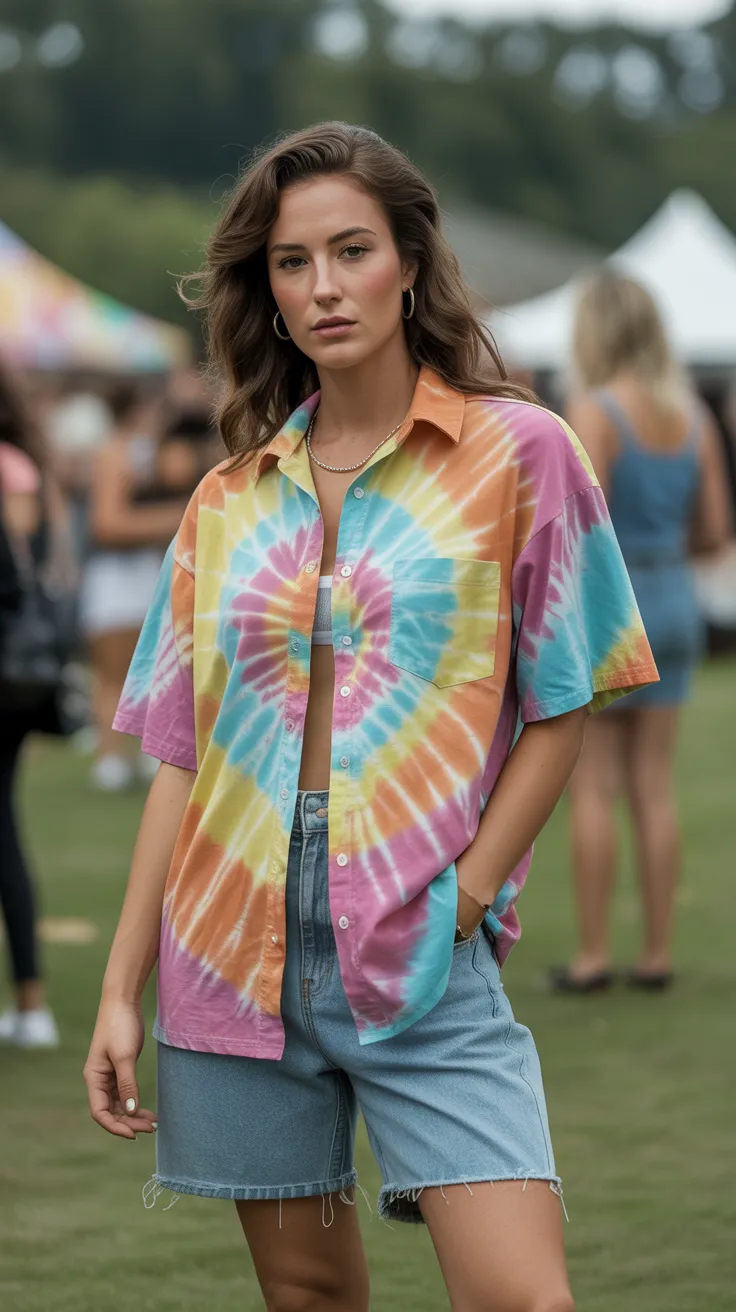 Nothing screams retro like a vibrant tie-dye shirt paired with baggy shorts. This look captures the essence of 90s women’s fashion outfits perfectly. The colorful swirls of the shirt bring a playful vibe, making it a standout piece in any wardrobe.