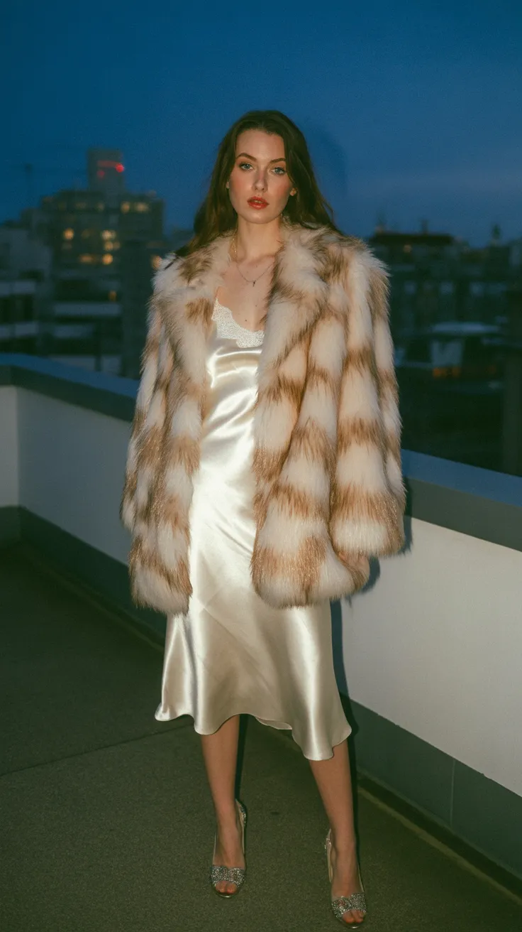 Accessorizing is key to completing this look. A statement bracelet or some bold earrings can elevate the outfit even more. The combination of the soft slip dress and the bold faux fur creates a striking contrast that is sure to turn heads.