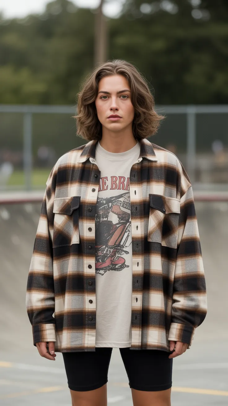 The vintage flannel shirt paired with a graphic tee and biker shorts is a classic look that screams retro 90s outfits for women. This combination is both stylish and comfortable, making it perfect for casual outings or just hanging out with friends.