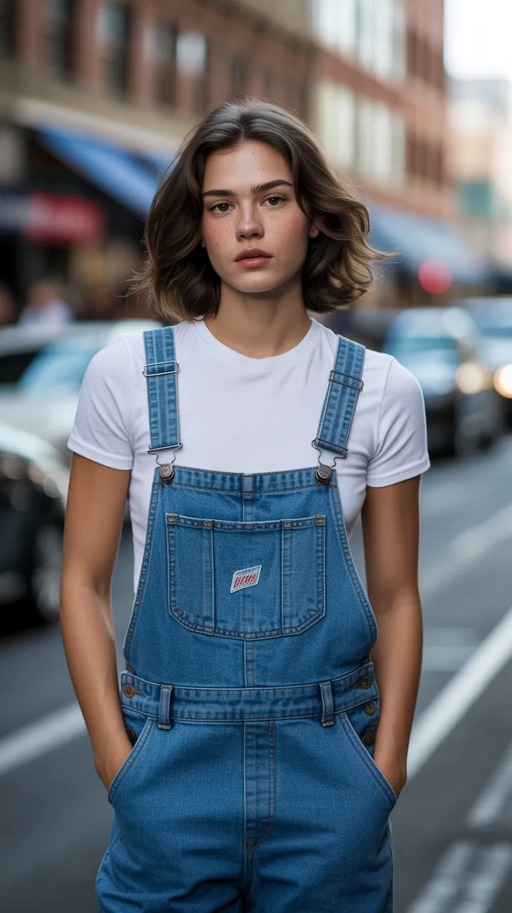 The model pairs the overalls with a simple white tee, keeping the outfit fresh and easygoing. This combination is perfect for anyone wanting to channel that classic 90s fashion women casual style. The rolled-up cuffs add a touch of flair, making it a versatile choice for various occasions.