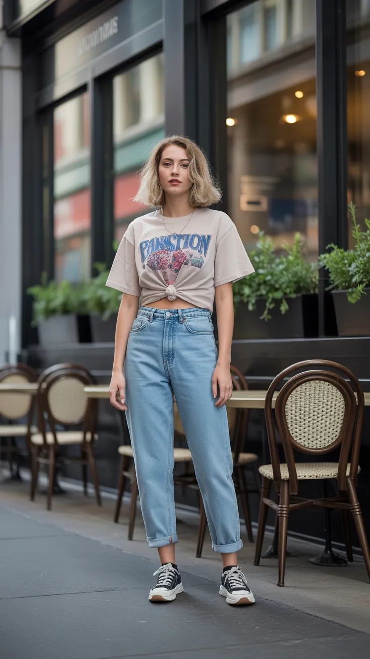 The tucked-in tee adds a touch of structure to the outfit. A graphic tee, like the one shown, brings a playful vibe that nods to 1990s fashion women casual styles. This combination is perfect for a day out or a casual hangout with friends.