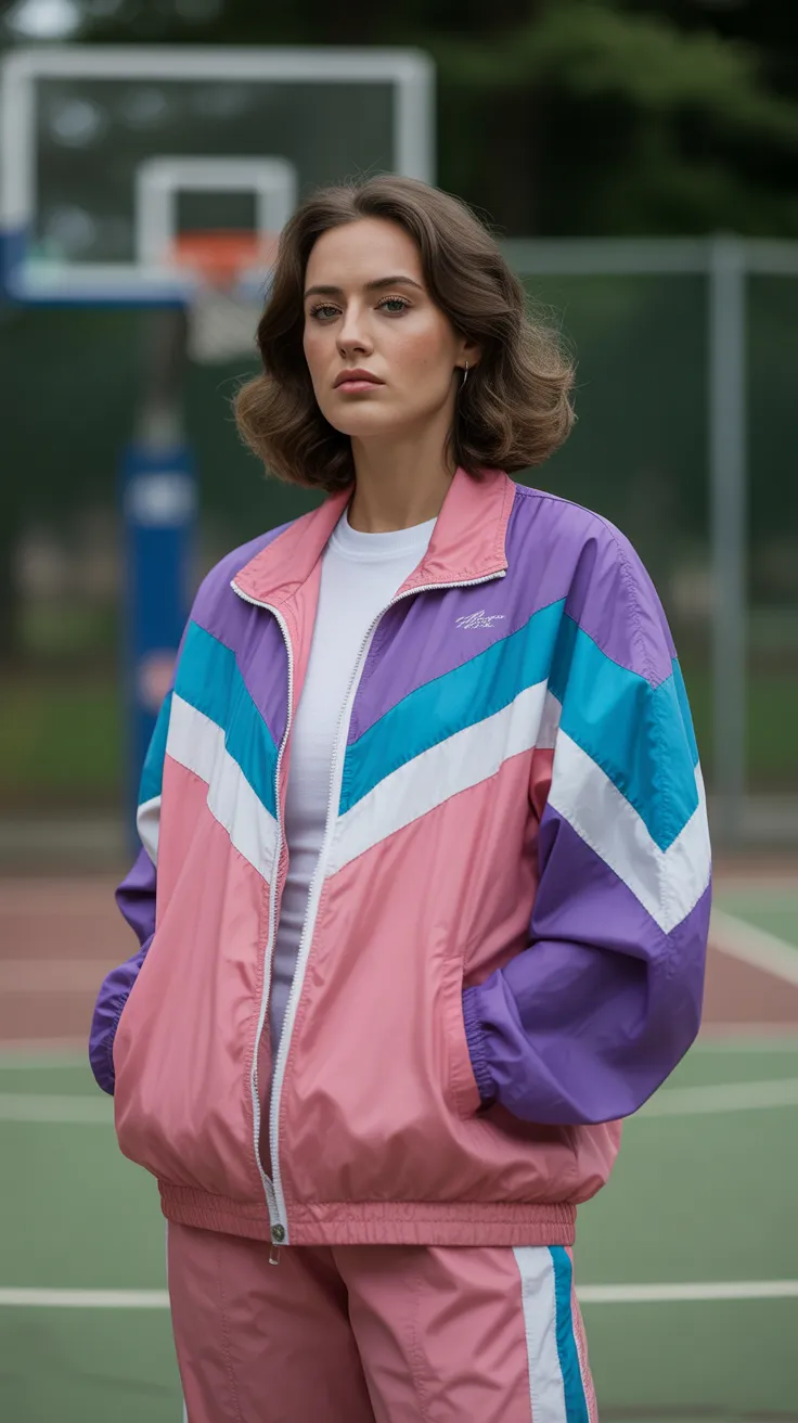 The windbreaker features a classic design with vibrant stripes, bringing back memories of 1990s fashion women casual. It’s lightweight and easy to wear, making it a versatile piece for any wardrobe. Pairing it with track pants adds a relaxed feel while still keeping the style on point.