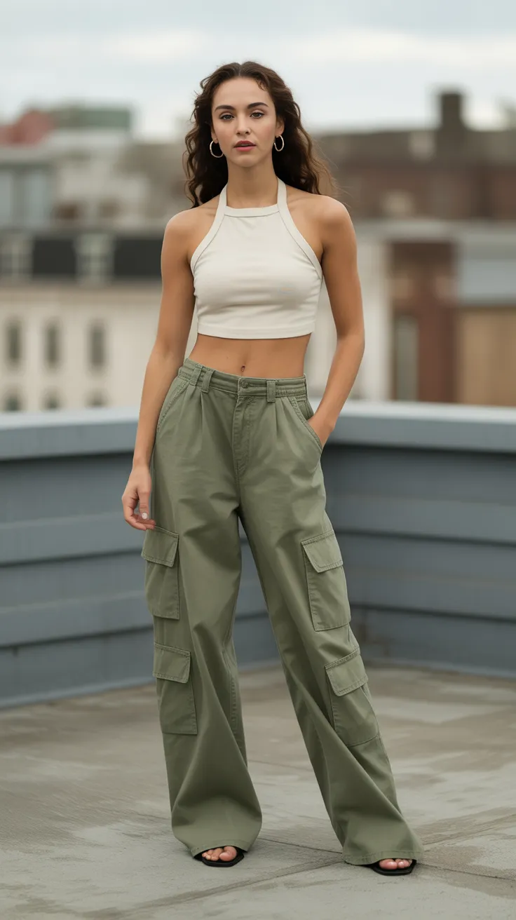 The model in the image showcases this style effortlessly. The combination of the loose-fitting cargo pants and the sleek halter top creates a balanced silhouette. Hoop earrings complete the look, adding a classic 90s flair that’s hard to resist.