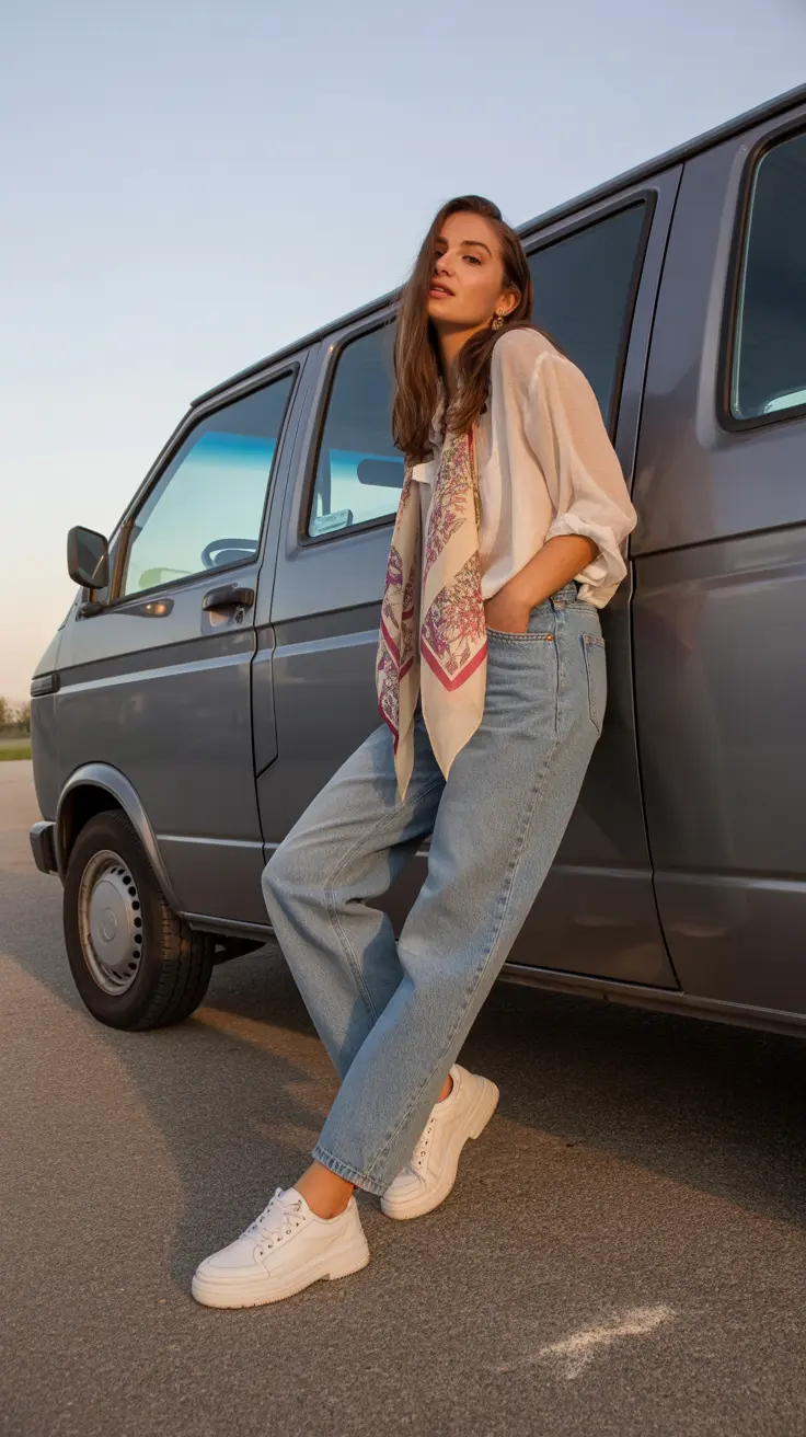 Completing the outfit with white sneakers adds a fresh vibe, perfect for exploring new places. This look is versatile enough for a quick stop at a roadside diner or a scenic view along the way. If you’re looking for outfit inspo for your next road trip, consider this cute casual outfit that balances comfort and style effortlessly.