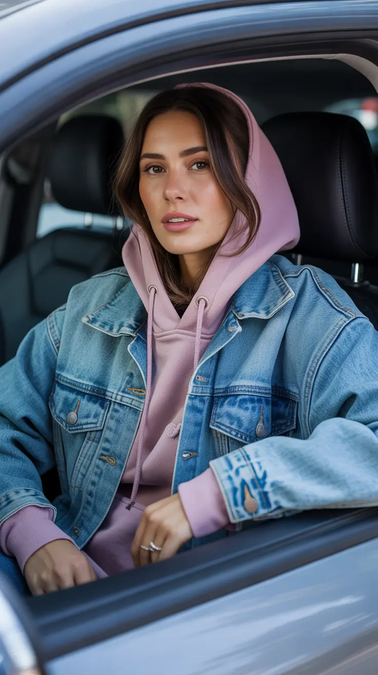Layering is key for any road trip outfit, and a hoodie paired with a denim jacket is a classic combo that never goes out of style. This look is perfect for those long drives where comfort meets cute casual outfits.