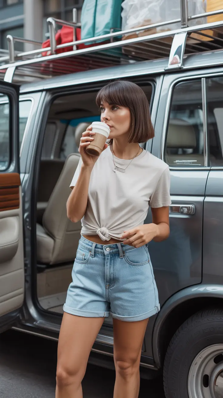 In the image, you can see three friends enjoying their time on a road trip. They’re lounging in the back of a car, showcasing their stylish yet casual outfits. The classic white tee paired with high-waisted shorts is a timeless look that fits perfectly into any weekend style. The addition of sneakers makes it travel-ready, ensuring comfort during those long hours on the road.