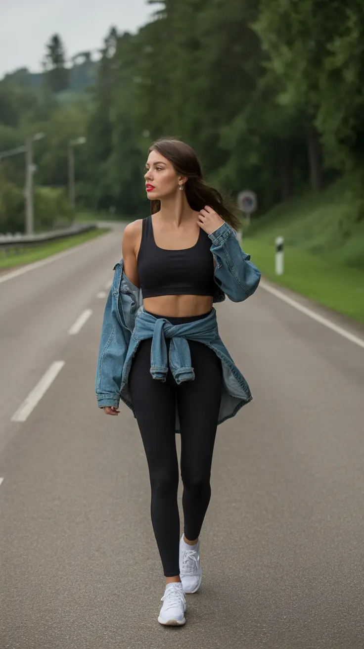 When it comes to road trip outfits, chic athleisure is a go-to choice. Imagine a stylish look that combines comfort and flair, perfect for those long drives. In this outfit, leggings and a crop top create a sleek silhouette while keeping things casual.