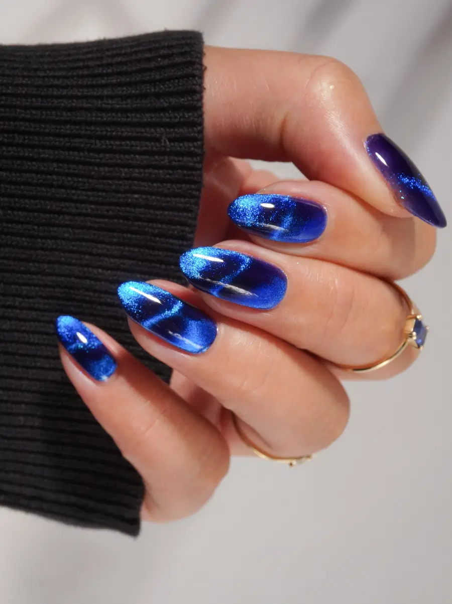 Bold and eye-catching, these royal blue nails feature a chrome-like metallic sheen that reflects light beautifully. The smooth almond shape keeps the look chic while still leaning into a bold, confident style.