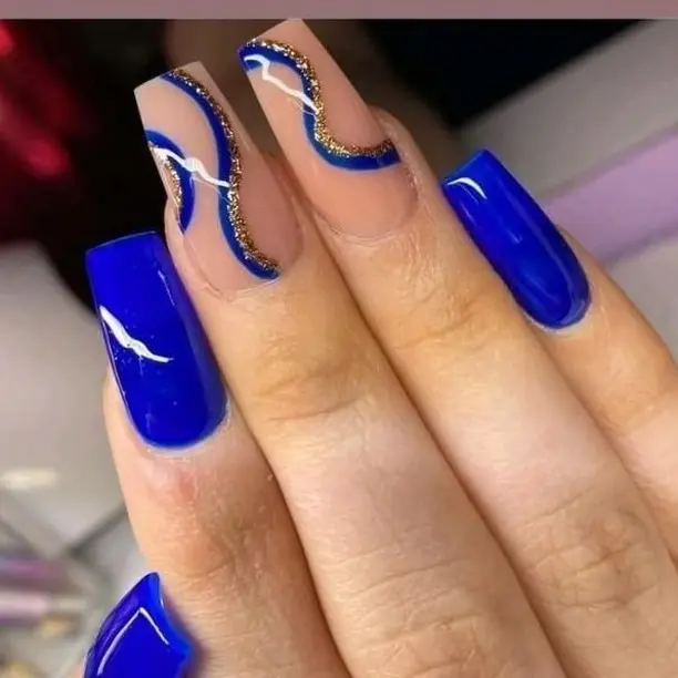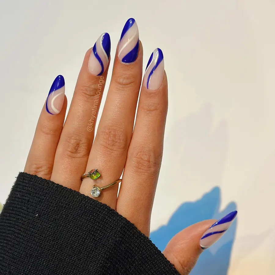 These royal blue nails mix soft nude bases with bold, curvy blue swirls for a fun, youthful vibe. The design feels lighthearted and expressive, making it perfect if you love cute nails that still look clean and well-balanced. The glossy finish keeps everything polished without losing that playful edge.